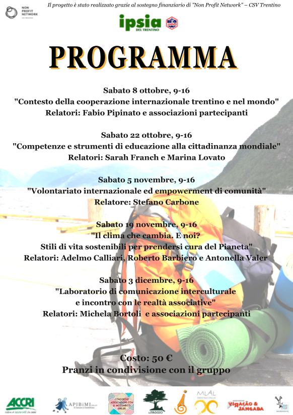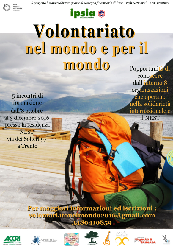 "Volontariato nel mondo e per il mondo" è il percorso formativo che IPSIA del Trentino promuove insieme a 7 altre organizzazioni di cooperazione internazionale del Trentino: ACCRI ONG, A.P.I.Bi.M.I. Onlus, CAM Trentino Mozambico, Why Onlus, Mlal Trentino Onlus, Viração&Jangada, Nest Trento.